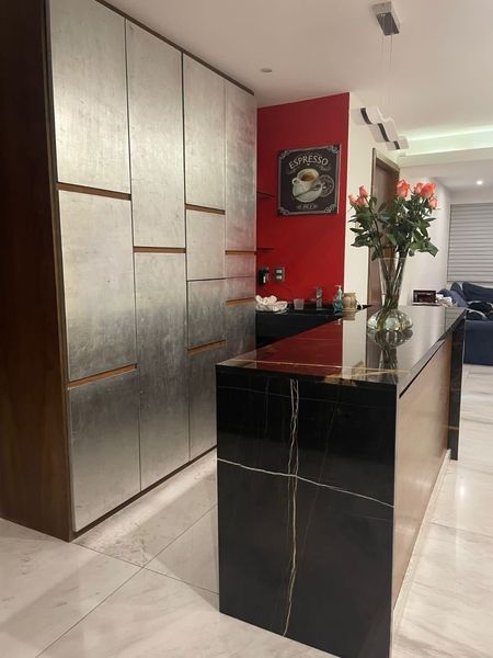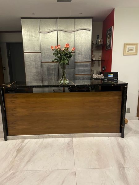 Coffee station (o bar) con barra de un lujoso mármol negro y puertas de hoja de plata