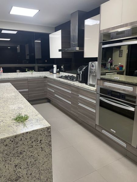 Enorme y moderna cocina integral con cubierta de granito y una súper barra en el centro